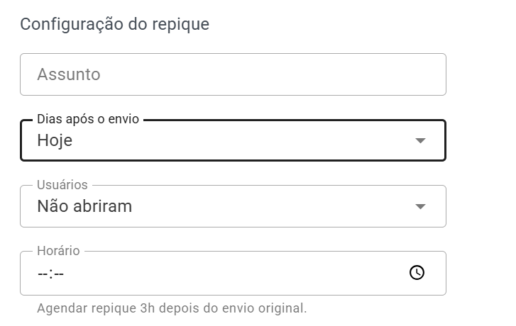 Exemplo: Se o envio original foi há 3 dias e você quer enviar o repique hoje, selecione "3 dias após o disparo", e não "Hoje".