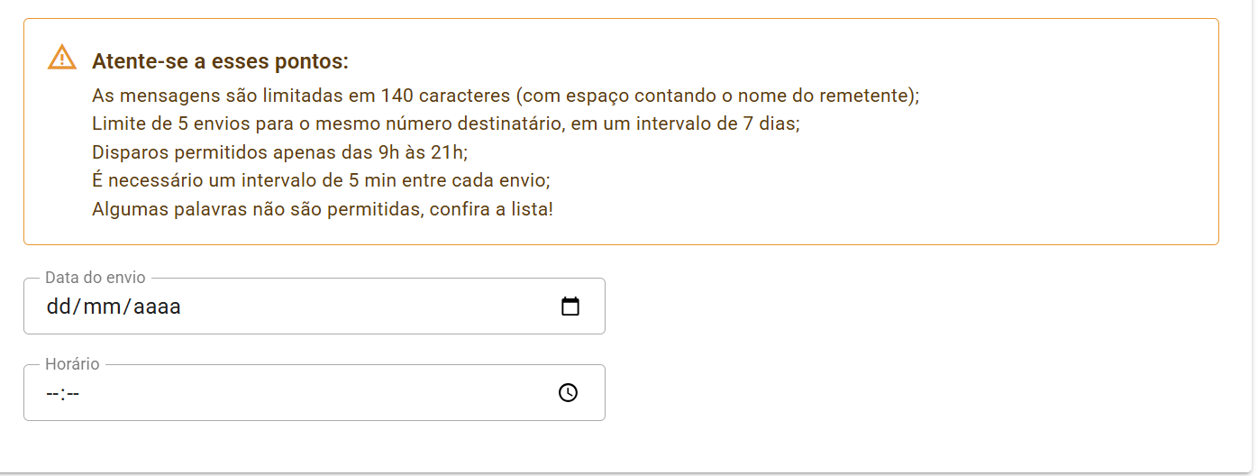 - Horário permitido: Disparos só podem ser realizados entre 9h e 21h.