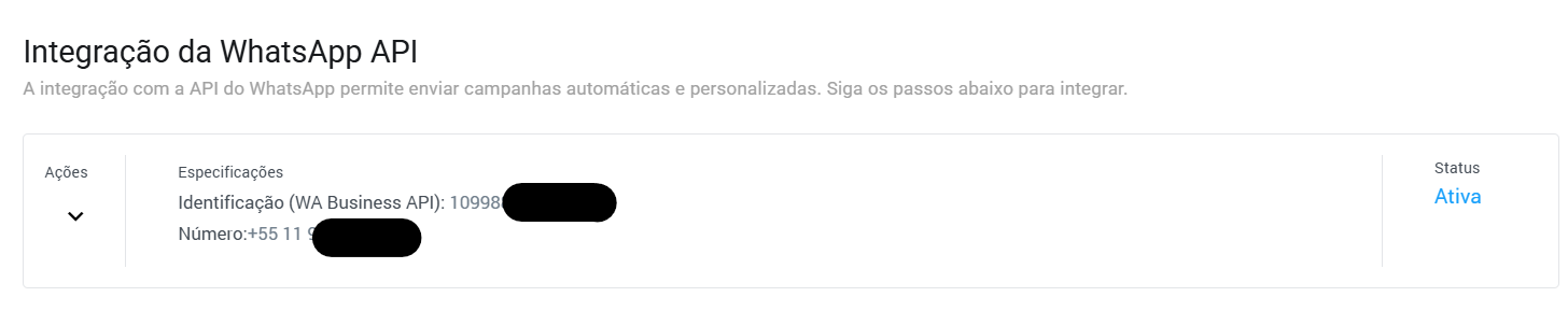 Após a conexão, as informações estarão disponíveis na aba Configurações e o WhatsApp estará com o status de integração Ativa.