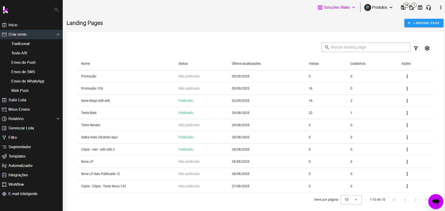 Filtro: possibilita filtrar LPs por Publicado ou Não publicado.