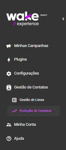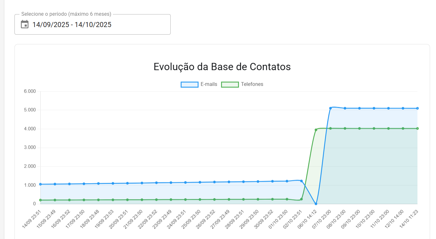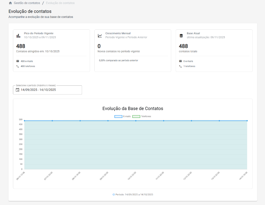 A página Evolução de Contatos permite acompanhar o crescimento da sua base ao longo do tempo.
