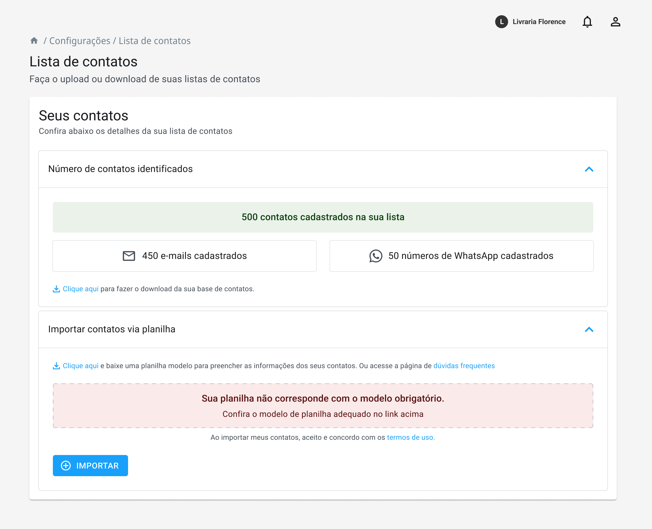 O sistema não conseguiu concluir o processamento do arquivo ou não foi possível importar nenhum dos contatos.