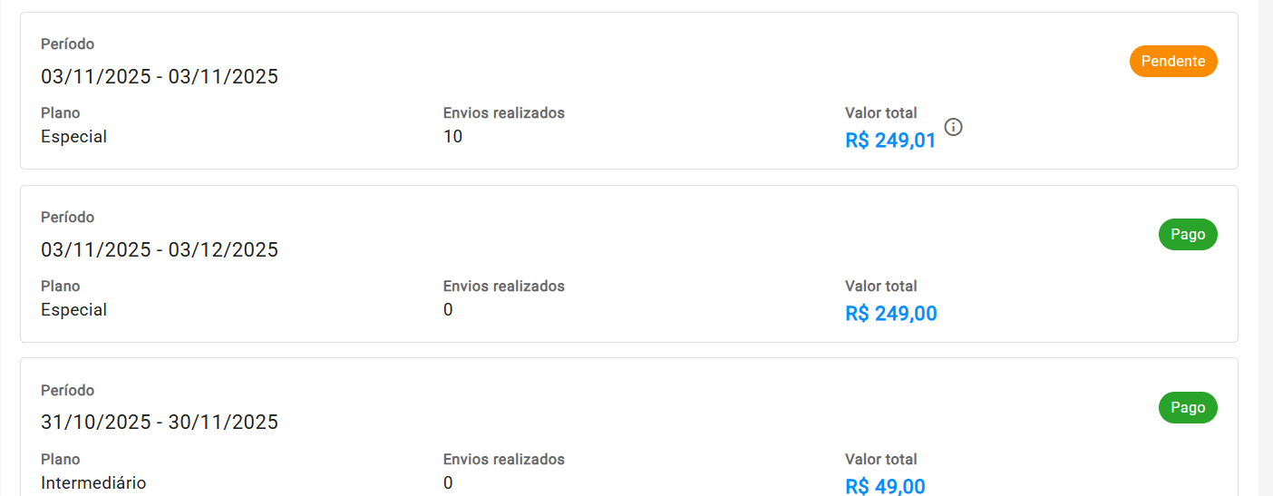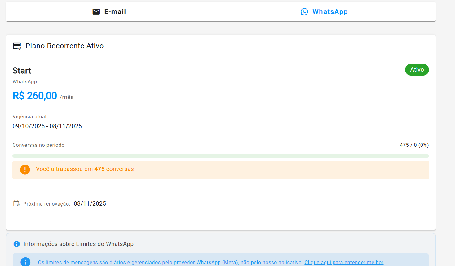 Na seção “Meu Financeiro”, você encontra informações completas sobre os planos e cobranças da sua conta, incluindo histórico de faturas, limites de uso e dados de desempenho de cada canal (E-mail e WhatsApp).