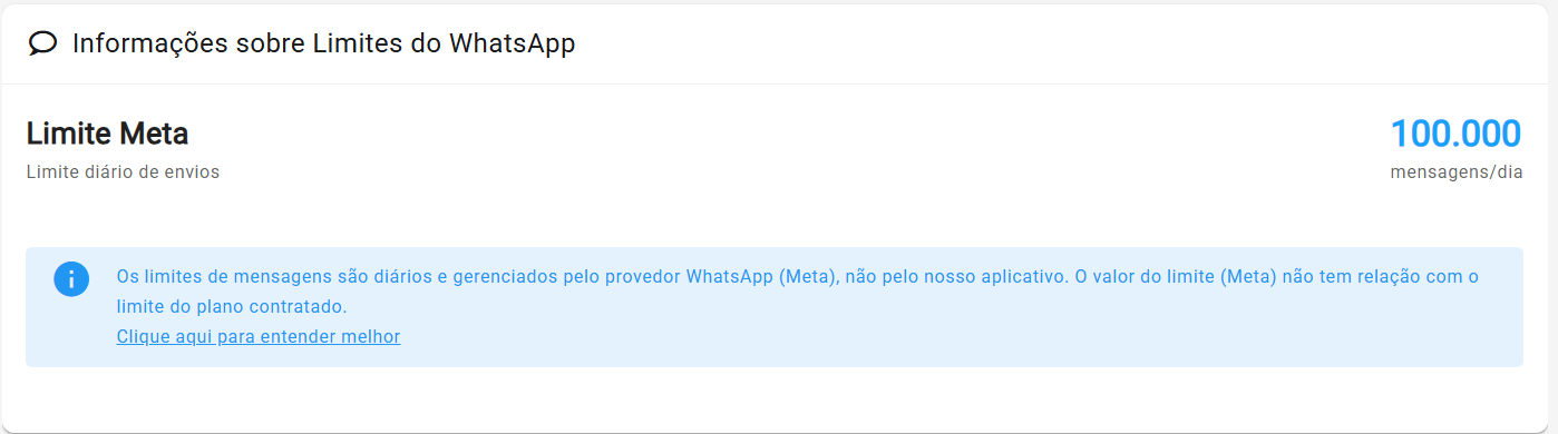 O Limite Meta corresponde ao número máximo de mensagens que podem ser enviadas por dia por meio da API do WhatsApp.