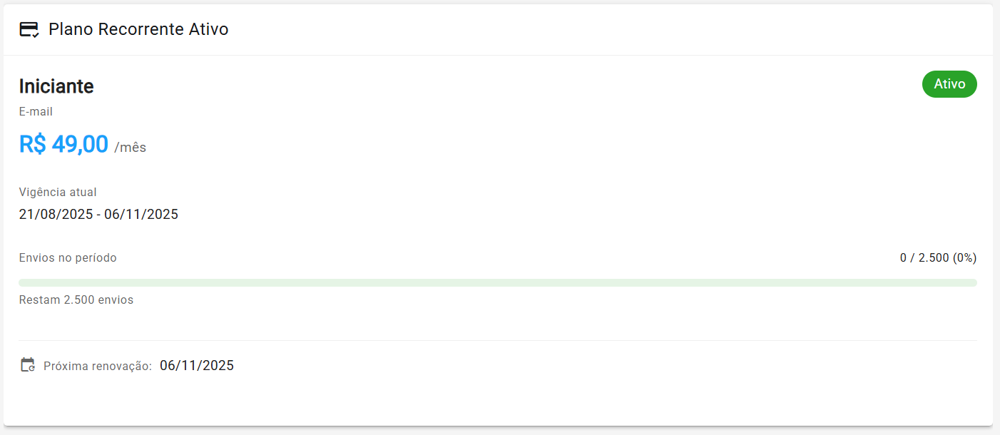 Consultar qual é o plano ativo e o total de disparos realizados no período atual;