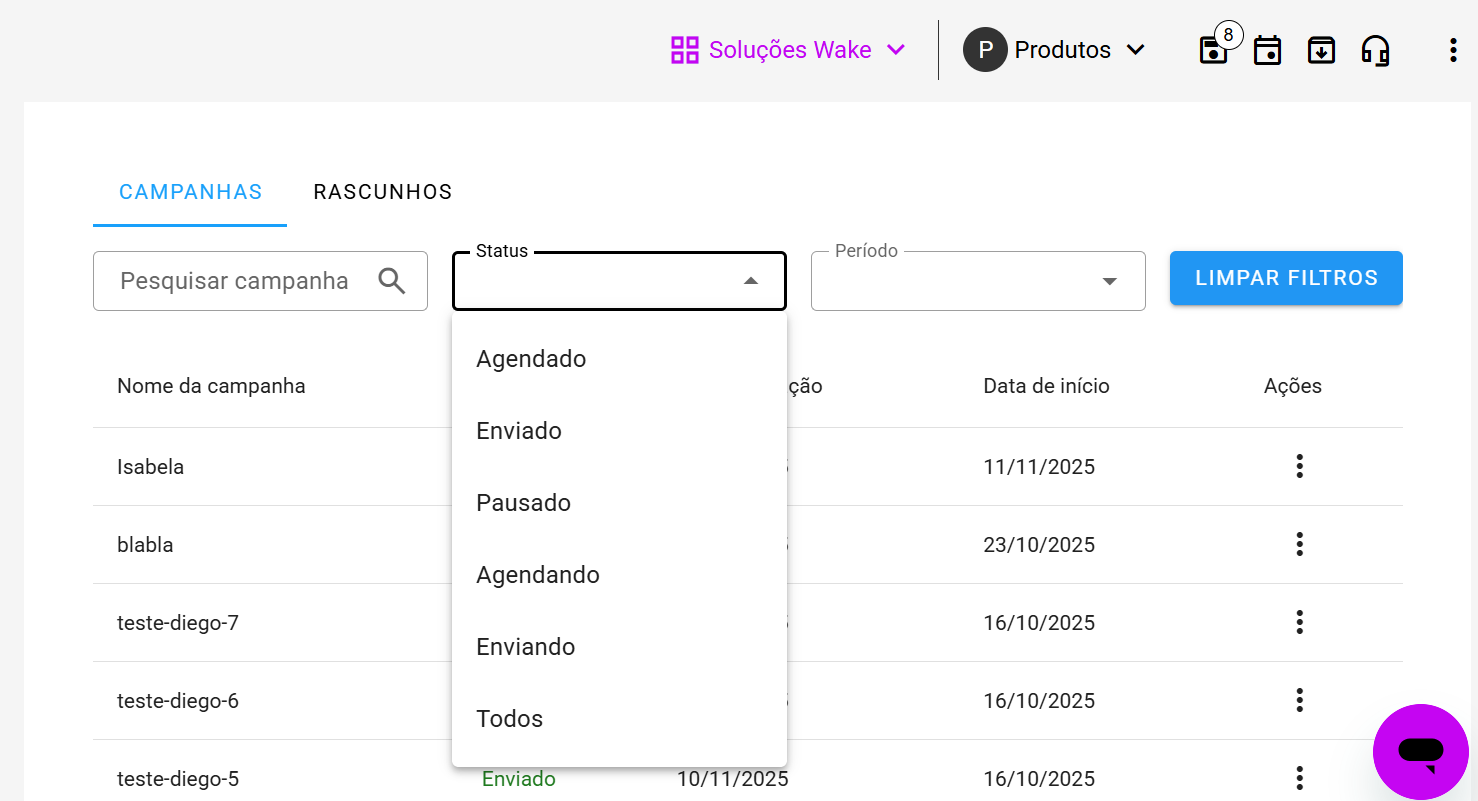 Filtrar por status (Agendado, Enviado, Pausado, etc.)