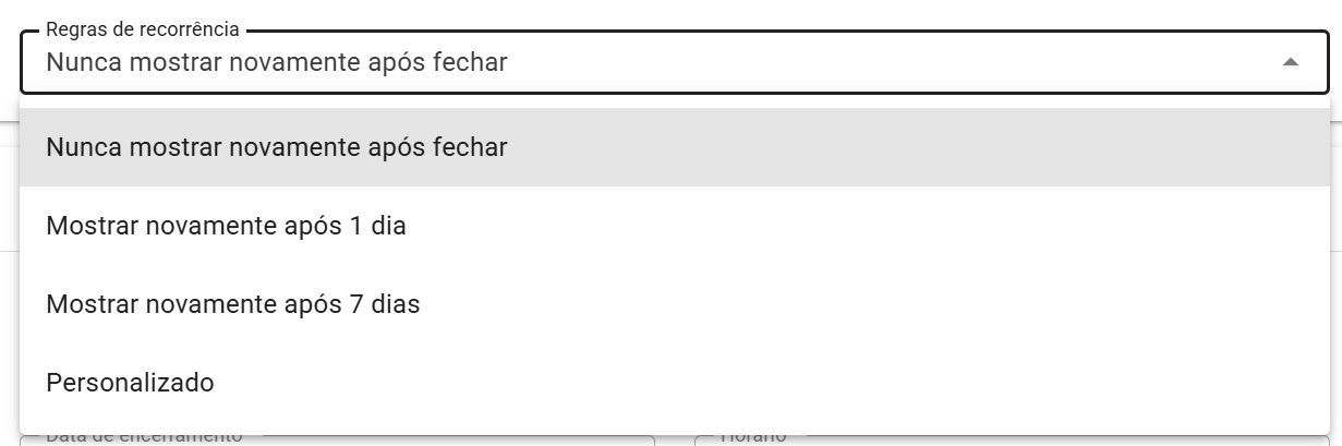 | Nunca mostrar novamente após fechar | A ativação será exibida apenas uma vez. Depois que o usuário fechar, ela não será mais mostrada. |