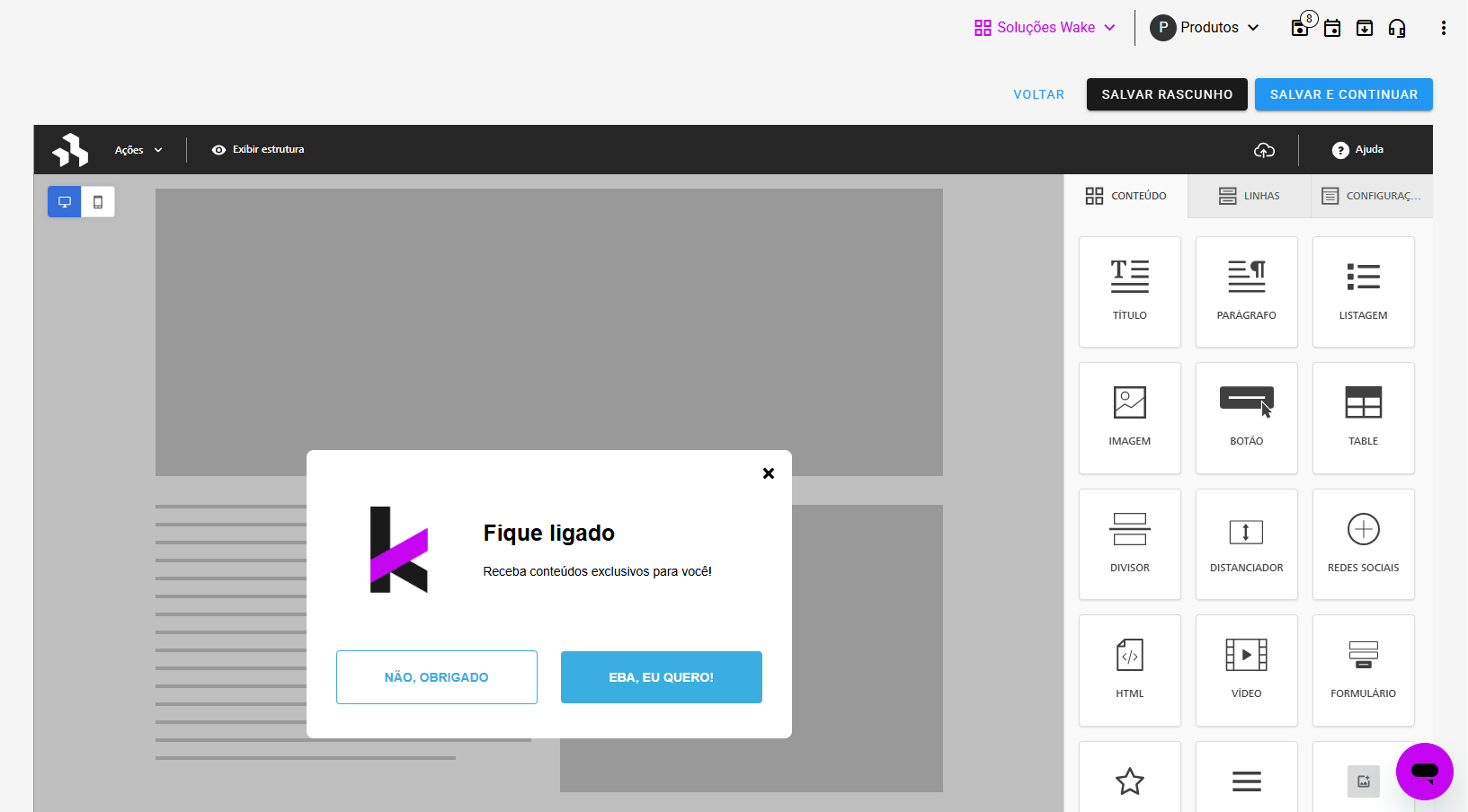 Editar o template antes de usar → abre o Editor Wake Experience, permitindo personalizar o layout, textos, cores, botões e comportamento do Onsite antes de salvar e seguir para as configurações.