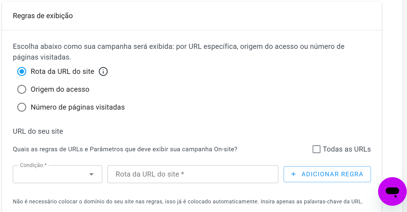 | Modo de exibição | Escolha o tipo de condição que definirá a aparição da ativação: URL específica, Origem do acesso (ex: tráfego vindo de redes sociais, campanhas, etc.) ou Número de páginas visitadas. |