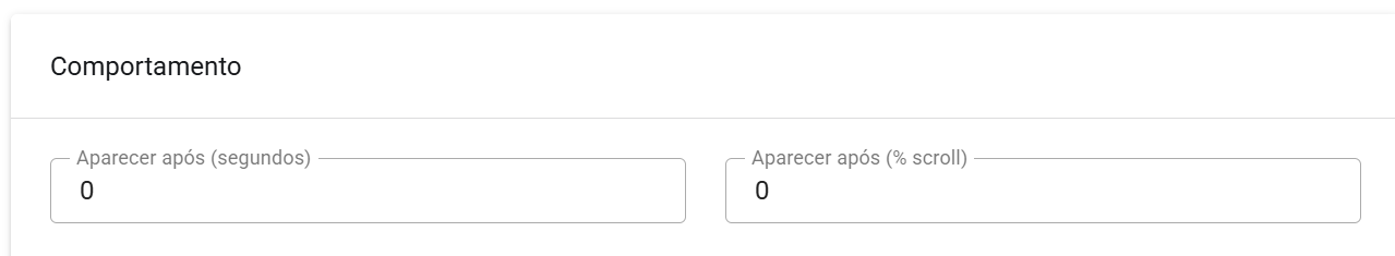 Aparecer após (% de scroll): exibe a ativação somente quando o usuário rolar uma determinada porcentagem da página (por exemplo, 50%).