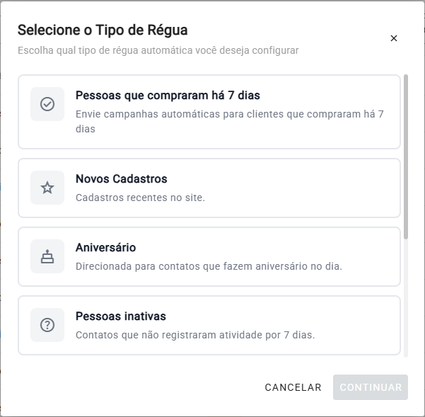 Ao criar uma campanha automática, selecione o tipo de régua desejada: