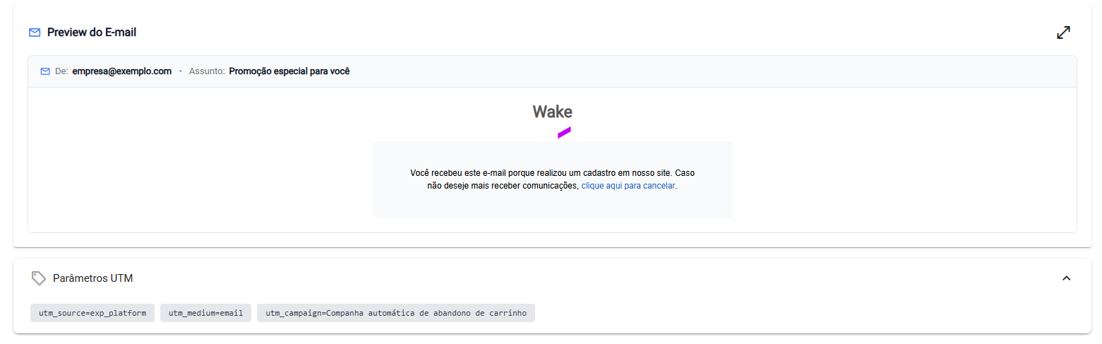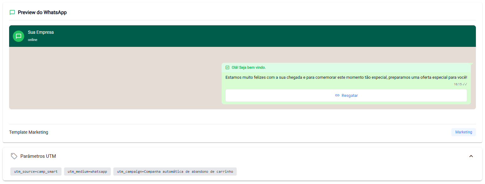 Os links da campanha são automaticamente parametrizados com UTMs padrão, permitindo o acompanhamento de resultados.