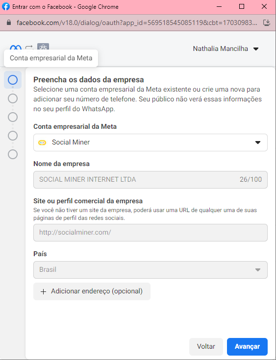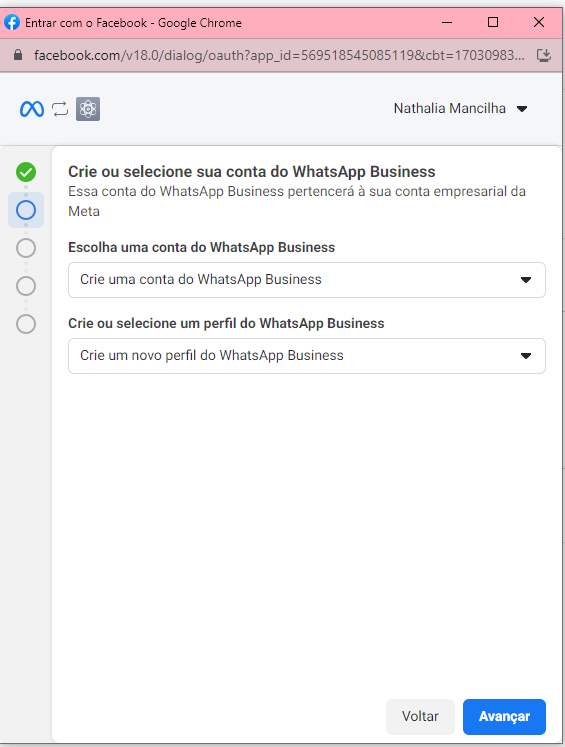 Ao clicar em Conectar com o Meta, uma janela da Meta será aberta para que você faça login com sua conta do Facebook na Meta que esta com permissão para a conta Business