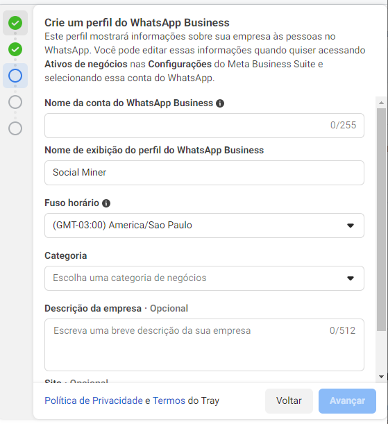 O status da conta indica em que etapa está a validação da empresa junto à Meta. Ele verifica se a empresa cumpre os requisitos e políticas da plataforma.