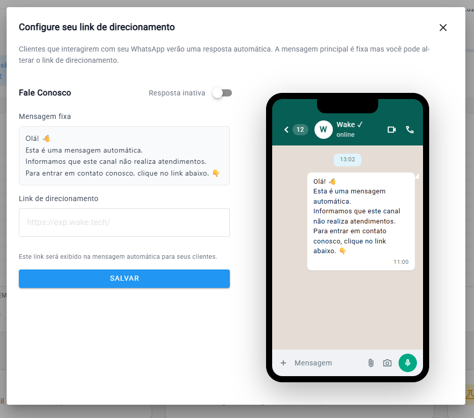 Clique em Salvar. Após ativada, todos os clientes que interagirem com o WhatsApp receberão a mensagem automática configurada.